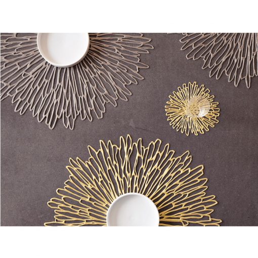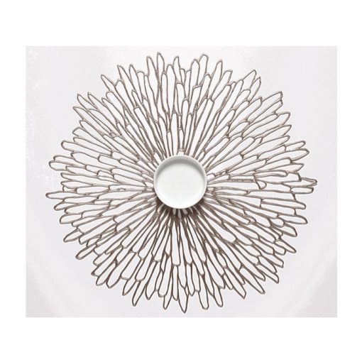 Combining the organic exuberance of a chrysanthemum with the graphic refinement of a contour line sketch and a modern palette of metallic hues, Bloom is a fresh interpretation of florals. This flexible openwork placemat can also function as a charger, acting as a decorative base for whatever is placed on top.