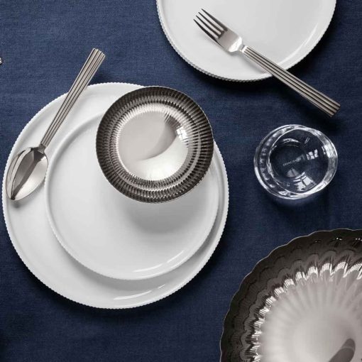 Minimalist yet still with subtle detailing, this small porcelain plate is perfect for lunch and salads. The small ridges add a tactile element that references Bernadotte’s functionalist Art Deco aesthetic whilst the flat shape of the plate is entirely contemporary. Mixed with the larger plates and bowls from the range, it adds a touch of sophisticated Scandinavian style to the dining experience.