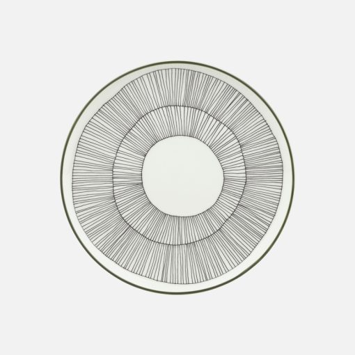 This Oiva plate features the Kukat Puhkeavat pattern decal and a hand painted green rim. It is dishwasher, oven, microwave, and freezer safe.