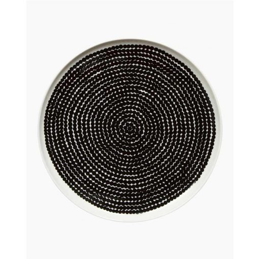A white stoneware plate in the Räsymatto motif. It’s dishwasher, microwave, and freezer safe; glazed colors and pattern remain vibrant.