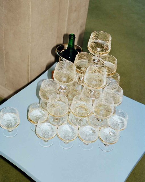 A sophisticated, nuanced, and palpable feel of rain has been captured in the glass products as an organic, relief-like surface structure applied to the surface in a sketched manner that is typical for the designer.