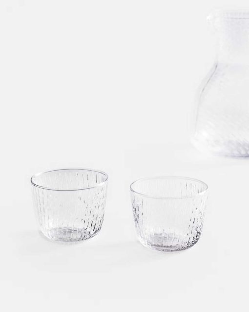 A sophisticated, nuanced, and palpable feel of rain has been captured in the glass products as an organic, relief-like surface structure applied to the surface in a sketched manner that is typical for the designer.