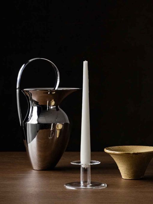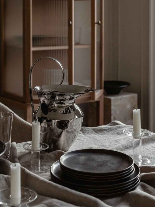 Equal parts practical and beautiful, the sweeping silhouette of the Etruscan Pitcher is shaped from mirror-polished stainless steel for a hardwearing yet elegant finish. Its exaggerated proportions include a tall, curved top handle and a tapered spout for easy pouring. The voluminous design makes an equally bold statement when serving chilled drinks at the table as it does used as a decorative object or cut flower vase. Available in two sizes: 30 cm and 33 cm.