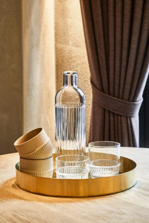 The Decanter conveys the same design as the Bar Glass with the characteristic grooved bottom and clear top that provides the decanter with a raw yet elegant look.
