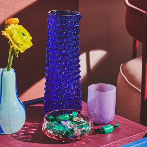 Danish Summer Carafe can be used as a jug containing refreshing drinks, a vase for beautiful flowers or as a piece of glass art in an aesthetic still life. Each individual jug is mouth-blown, so all products have their own unique and varying shape, color and pattern united in a piece of aesthetic craftsmanship.