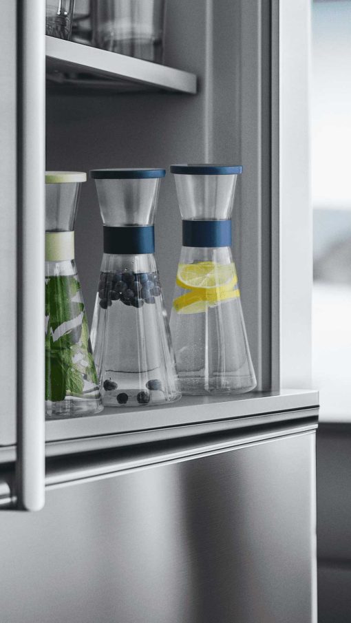 Grand Cru carafes in colours – an elegant and subtle colour update of a true design icon. With the Rosendahl Grand Cru carafe adorned with details in a soft and pleasant sand, you get a stylish enhancement of the iconic Grand Cru carafe in timeless aesthetics and a colour palette that evokes a sense of understated luxury where sky meets sea. The colour is new and modern, and the carafe naturally comes with a colour-updated lid that beautifully and functionally keeps the water fresh in the fridge, but you will easily recognise the silhouette of the classic Rosendahl Grand Cru carafe. The new Grand Cru carafe with colours holds the same 90 cl as its predecessor and comes in the same super durable glass quality as the original version. With the new soft sand colour on the lid and neck band, both in stainless steel, you create a very special and stylish expression that is new and modern, yet still true to its origins. The Grand Cru series is one of the great classics in Rosendahl’s range and has over the years moved into many homes, where it has become a part of everyday life. With the simple and functional quality design with the four iconic grooves, you can focus on both food and drink while enjoying having a good base in the kitchen throughout life, where you can easily and conveniently combine your way to your own personal style with the series’ diversity of tableware and glass. Whether you choose the iconic carafe with the signature band on the neck and the matching lid in this soft and pleasant sand or one of the other colour variants – the natural and harmonious ocean blue or the harmonious deep forest green – you can look forward to one of Rosendahl’s finest design classics in a sophisticated and refined colour palette that evokes a sense of luxury and elegance in a new and subtle way. Because the coloured details on all three Grand Cru water carafes still unfold in the spectrum of classic Nordic tones, the carafes, with their understated design, naturally fit most table settings, wherever you are and whatever is on the menu.