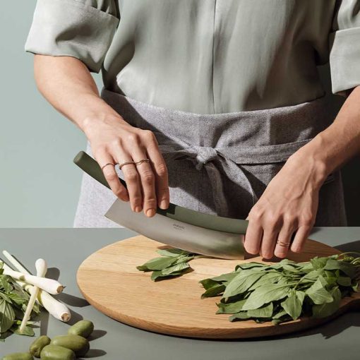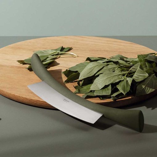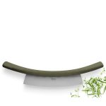 This crescent-shaped functional knife makes light work of chopping vegetables. Simply rock the curved blade over the herbs, for example. The knife has a solid and comfortable handle at each end.