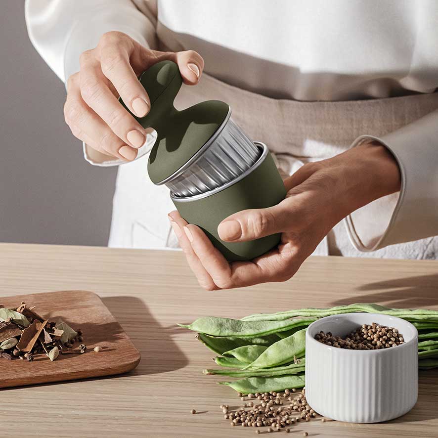 Grinds and crushes spices with a simple twisting back and forth action. The chosen spices are collected in the receptacle and ready for using in your food. The organic shape of the grinder ensures a good and comfortable grip.