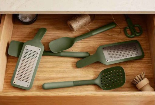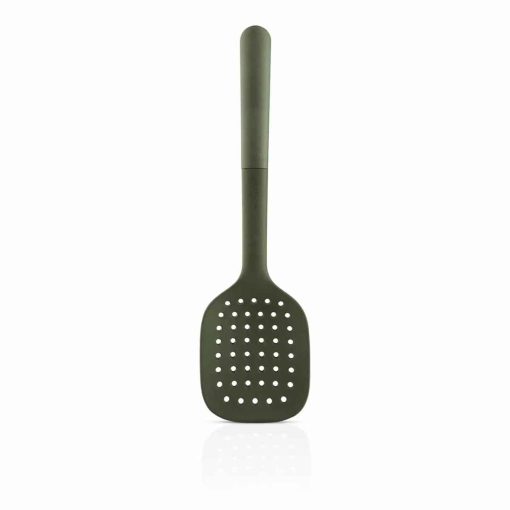 Versatile perforated ladle with rounded rim to reach all the way into bowl or pot sides