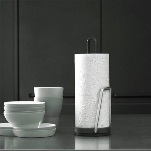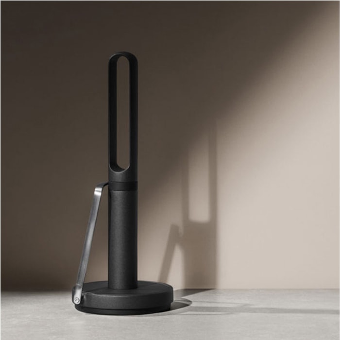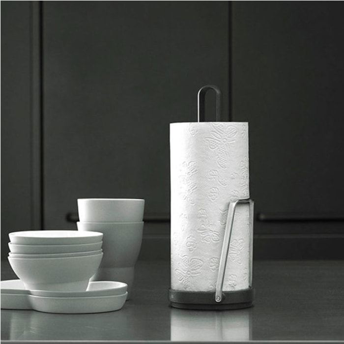 The Vipp kitchen roll holder helps control paper towels in the kitchen. A solid base gives the kitchen roll holder stability, and a stainless-steel arm holds paper towels in place. The Vipp kitchen roll holder is made to fit European standard-sized paper towels.