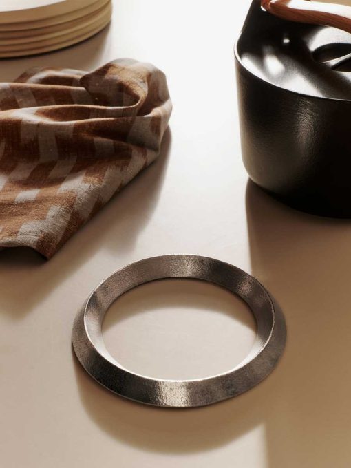 The Levee Trivet is crafted from durable, recycled aluminium, offering a sleek, sophisticated finish. Its geometric design, featuring a central triangle encased within a circular ring, combines visual elegance with a secure surface for hot pots or pans. Protective rubber pads gently preserve surfaces while enhancing the trivet’s refined aesthetic and stability with a minimalist form.