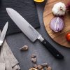 Santoku is a classic Japanese knife. The blade is narrow, sharp and high – this makes the knife the perfect tool when cutting vegetables finely. The high blade helps to protect the fingers from the sharp cutting edge – even when speed is of the essence.