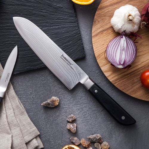 Endeavour [en-de-var] means “to strive”. The professional chef’s knives in the Endeavour range are made of Damascus steel. The middle of the blade’s cutting edge, made of Japanese VG10 steel, is enveloped by 33 layers of beautifully forged steel on each side. This method of manufacturing gives the Endeavour knives their characteristic appearance and makes them extremely sharp and durable. The Damascus forging technique was widespread during the Samurai days of glory when the sword makers from Seki achieved a legendary reputation for their Damascus swords. Technically, the Japanese masters leaned on a forging tradition that is alleged to come from Damascus.