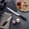The slim blade of the knife gives the possibility of cutting meat from the bone or if raw or cooked meat needs to be cut into thin strips. It is important to keep the knife sharp; so remember to use a sharpening steel rod every time you use the small chef’s knife.