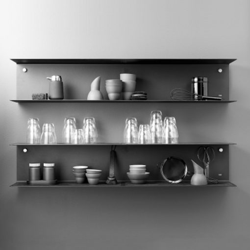 The is the largest of the two Vipp shelves. With two surfaces, the Vipp shelf is a functional storage option for every room of the house. An indentation in the two surfaces holds a silicone mat for protection of delicate items.