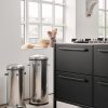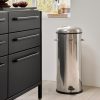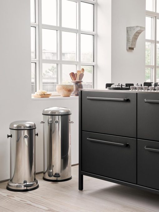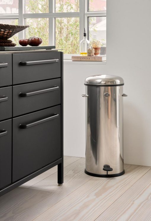 The Vipp17 pedal bin is a 30-litre waste bin and the largest of the Vipp bins. It is equipped with a damper mechanism for smooth closing of the lid, along with a rubber ring that ensures an airtight closure. The body is manufactured from either powder-coated steel or stainless steel, concealing a removable inner bin made of galvanised steel. Additionally, a rubber ring at the base safeguards sensitive surfaces.