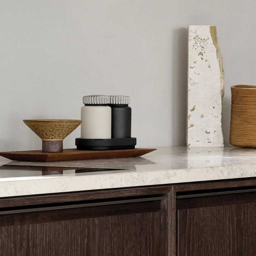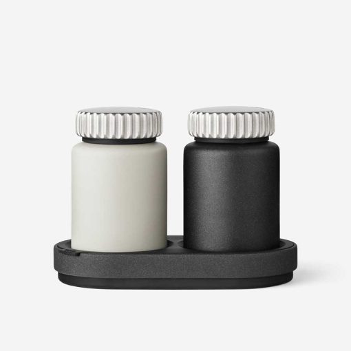 The Vipp salt and pepper mills are tabletop necessities for the kitchen or dining room. The set of mills are constructed with a swivel top and a durable ceramic grinder with a refined grinding sound. The shared base holds a removable inner section.