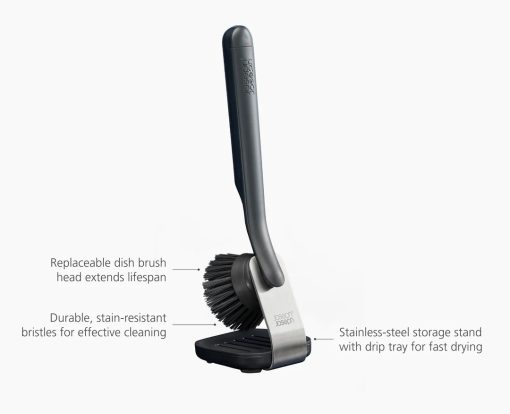 This dish brush has stain-resistant bristles, a built-in scraper, and a stainless-steel stand with a drip tray for easy storage. It’s part of the SinkTech™ system, with replacement heads available.