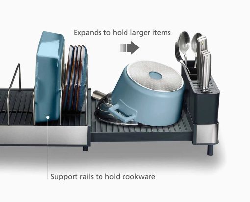 This high-capacity dish rack extends to twice its size to hold larger cookware items and prevent dish rack pile-ups. Featuring a movable spout to drain water, a dedicated draining space for cutlery and raised ribs designed to prevent water from becoming trapped under glasses and bowls. Its fingerprint-proof, stainless-steel makes it easy to maintain, and simply slide the expandable sections back after use to be more compact.