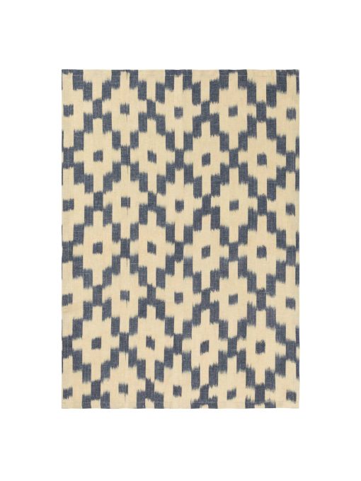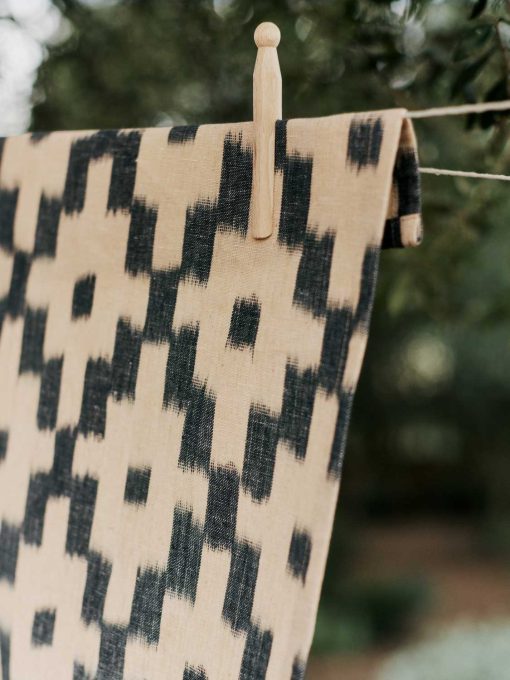 The Ikat Tea Towel is delicately handwoven from durable cotton, seamlessly blending heritage craftsmanship with Mediterranean influences. The yarns are pre-dyed in intricate patterns and skillfully woven on a traditional loom, creating a soft, blurred, and naturally organic aesthetic. This process results in designs that echo the geometric motifs of Mallorca, underlining the artisanal quality inherent in handwoven Ikat craftsmanship.