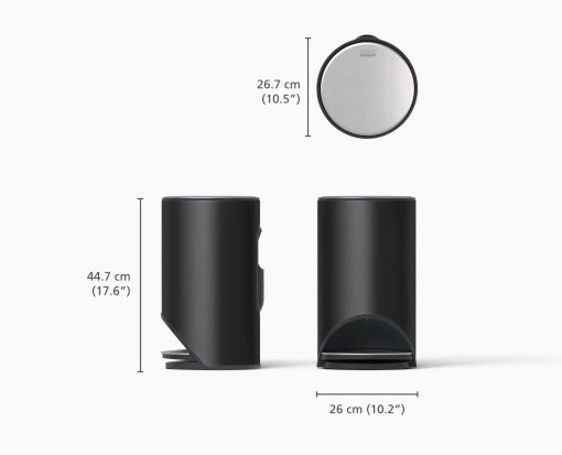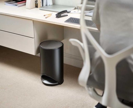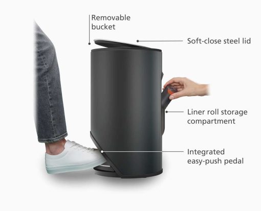 This stylish, circular bin has a large pedal that fits neatly within the footprint of the design, saving valuable floor space. Additionally, it features an integrated storage compartment at the back for liners, making them easy to access when needed. Finished in stylish carbon-black steel, it has a capacity of 10L (2.6 US Gallons).