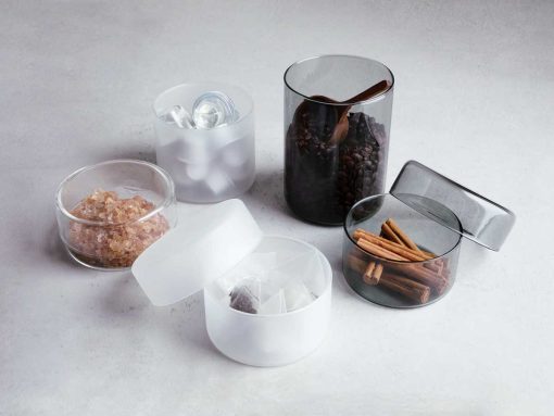 SCHALE is a glass case with a simple design. It comes in three different finishes, clear, smoke and frost. From casual to elegant spaces, it blends in well with a variety of scenes such as the living room, kitchen, bathroom, and desktop. Made of heat-resistant glass, it can be also used for storing food inside.