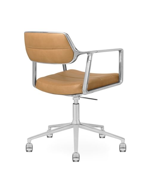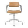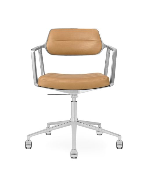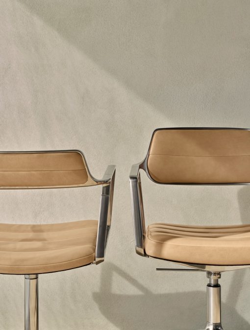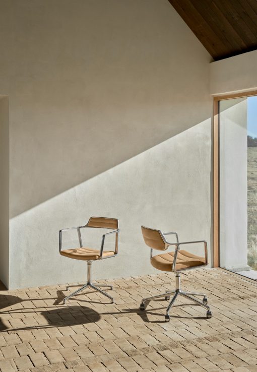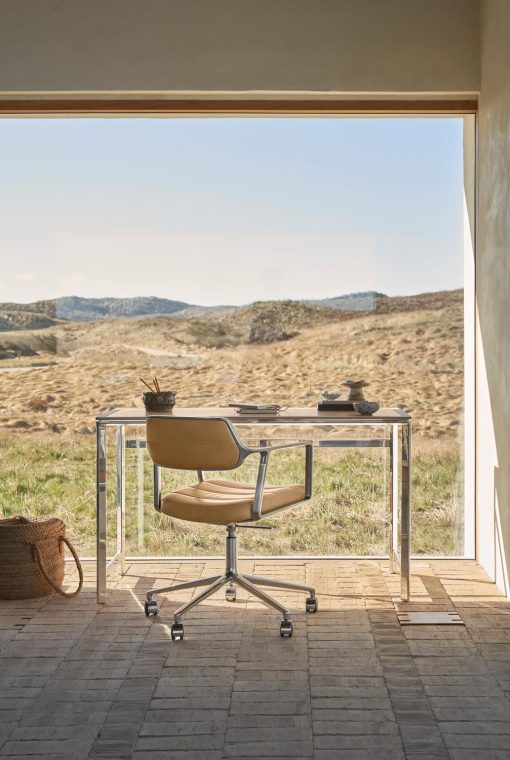 Vipp presents an extra-padded, height-adjustable iteration of its renowned Swivel chair. Intended for home office and conference room settings where people sit for extended periods while working, the Swivel chair offers a larger backrest and a highly comfortable seat. Designed with an adjustable height position, the seat branches out into a five-legged base on either castors or floor gliders, allowing for a 360° seat rotation.