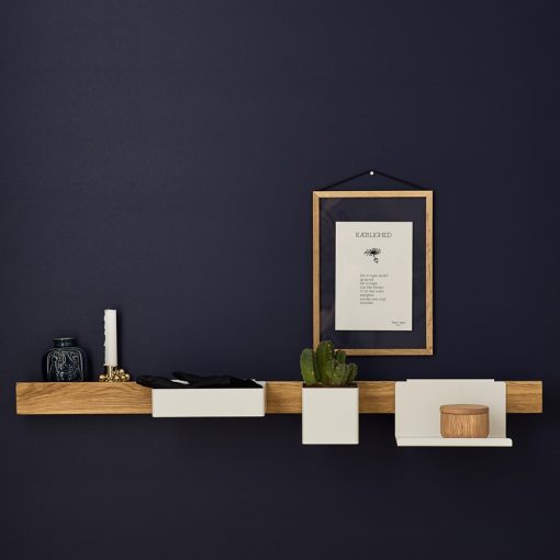 Flex is a multifunctional storage shelf, just the right size and with all the elements you need for keeping your bits and pieces tidy in all sorts of settings. Stylishly functional in the best tradition of Nordic design, Flex is made with a focus on high quality materials and combines a magnetic strip, shelf, hooks and boxes. Effortlessly interchangeable, you choose the set up that works for you. Flex uses a powerful magnet that allows the different elements to be placed just where you want them without wobbling. Boxes and hooks can easily be rearranged, dismounted and put back into place. Take the box with you and put it back when you’re done. Surfaces, tables and worktops can be kept clear with your items neatly organized but always kept easily within reach just where you need them.