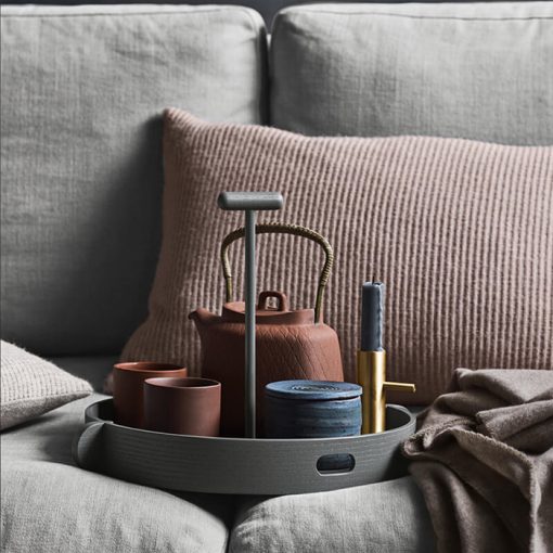 Tray is designed by Jaime Hayon and made by Fritz Hansen. The handle on the tray makes it sculptural but it is also practical to move the tray around with.