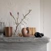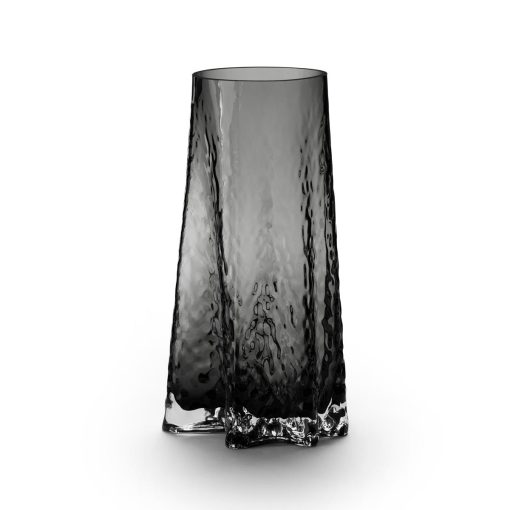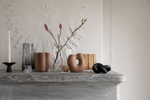 The Gry series is made of mouth blown glass which makes each piece unque. The collection contains tree vases and one tealight, all in three different colors. „Rich is detail, the Gry vases are elegant sculptures that elevates the flowers and water placed inside and plays with the daylight in Its structured surface and color. The candleholder takes the light from the wick lit inside and turns it into a beautiful pattern projected onto the surface on which it stands. The inspiration for the shape comes from the trunk of trees. Starting from the ground you can see the beginning of the roots before turning more round in shape further up. Gry, meaning dawn in Danish, has different word associations, as it is also a play on the word “gro” which means “to grow”.