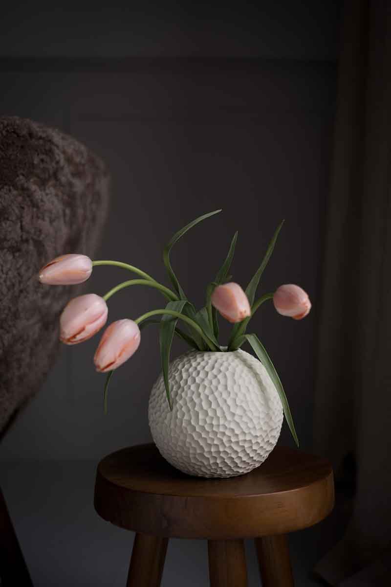Kaia belongs to the same collection as the adorable Isla vase. The design is typical for the Finnish artist Hanna Heino who pursues her inspiration from nature and raw materials she works with. Hanna has a intuitive way of working with clay and you can almost feel her fingers in the coral-like structure of the vase’s surface.
