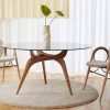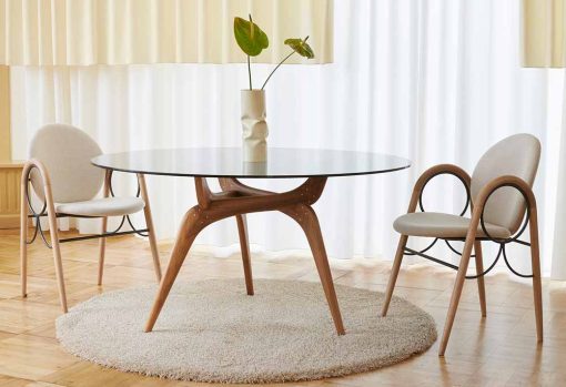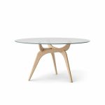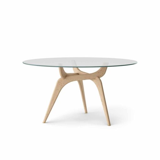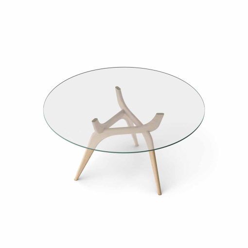 By combining a playful wooden leg construction with a floating glass tabletop, the tables manage to establish an almost poetic harmony between the simple and the sculptural.