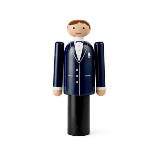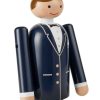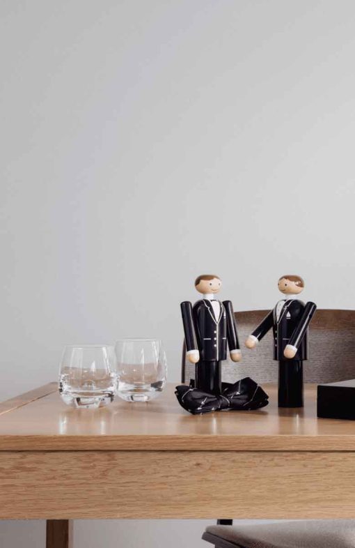 Kay Bojesen’s Groom is original and classic Danish wood craftsmanship at its best – designed in Bojesen’s iconic round shapes with a familiar twinkle in his eye. The groom measures 18 cm and is elegantly dressed in a dark suit with a white shirt and black bow tie. Meticulous details such as buttons, pocket handkerchief and lapels bring the jacket to life and the Groom’s happy and welcoming smile gives him charm and personality. The shape of the groom is based on the original figurines from the archives, which are simple and minimalist, but full of heart and soul. The figurine is made from FSC-certified beech and crafted in the same high quality that Kay Bojesen’s wooden figurines are known for. Give the Groom as a gift at the upcoming bachelor party, or let the elegant figurine find its way to the gift table in pairs with the Groom’s chosen partner.
