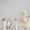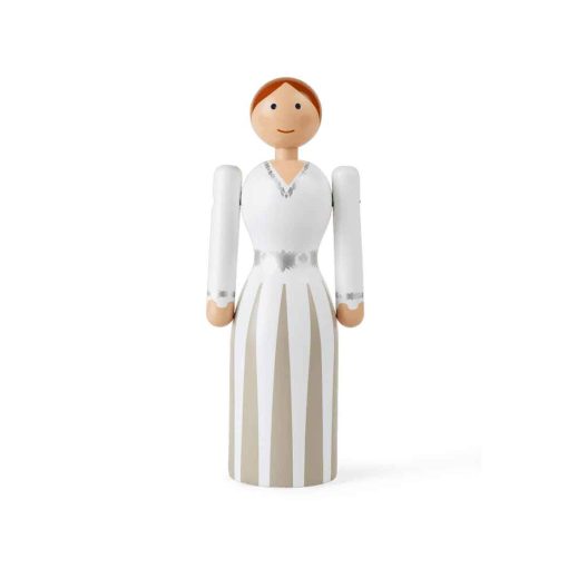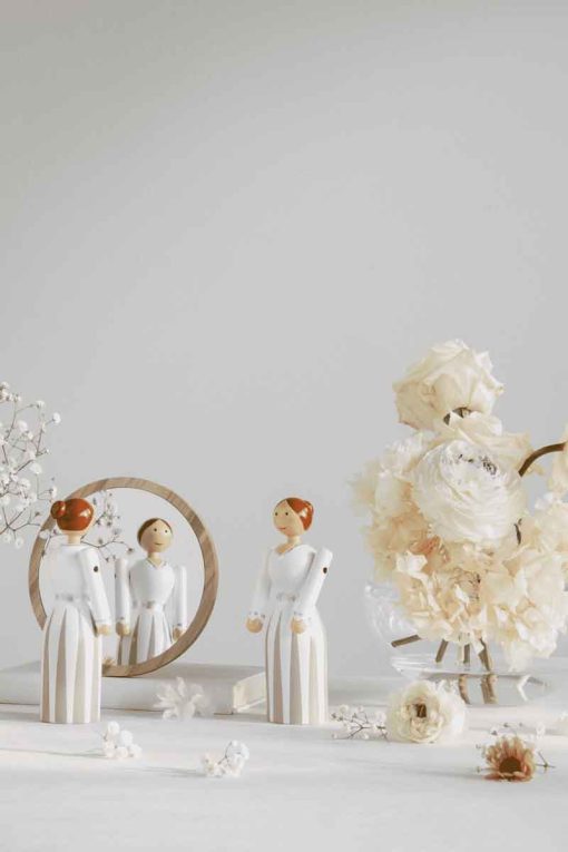 Kay Bojesen’s Bride is original and classic Danish wood craftsmanship at its best – designed in Bojesen’s iconic round shapes with a familiar twinkle in her eye. The bride measures 17 cm and comes in a floor-length white dress with long sleeves and feminine silver details in the form of a tie around the waist and at the wrists. Using a fine line, ultra thin stripes have been painted on the dress, giving it a sense of movement and texture. This touch accentuates the figurine’s soft shape and adds an extra dimension to the white dress. The hair is swept back in a simple hairstyle, and like Kay Bojesen’s original figurines, the cheeks are red and the smile is friendly and welcoming. The figurine is made from FSC-certified beech and crafted in the same high quality that Kay Bojesen’s wooden figurines are known for. Give the Bride as a gift at the upcoming hen party, or let the elegant figurine find its way to the gift table paired with her chosen partner.