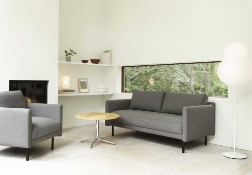 The Rar collection takes its name from the Danish word for pleasant, alluding to its soft and comfortable seat and uncomplicated expression. The collection comprises an armchair, a 2 seater sofa and a 3 seater sofa, all with the same simplistic, timeless design language. Rar is crafted from PU foam with a wooden reinforcement structure inside and powder-coated steel legs and comes in two different textiles and one leather option.