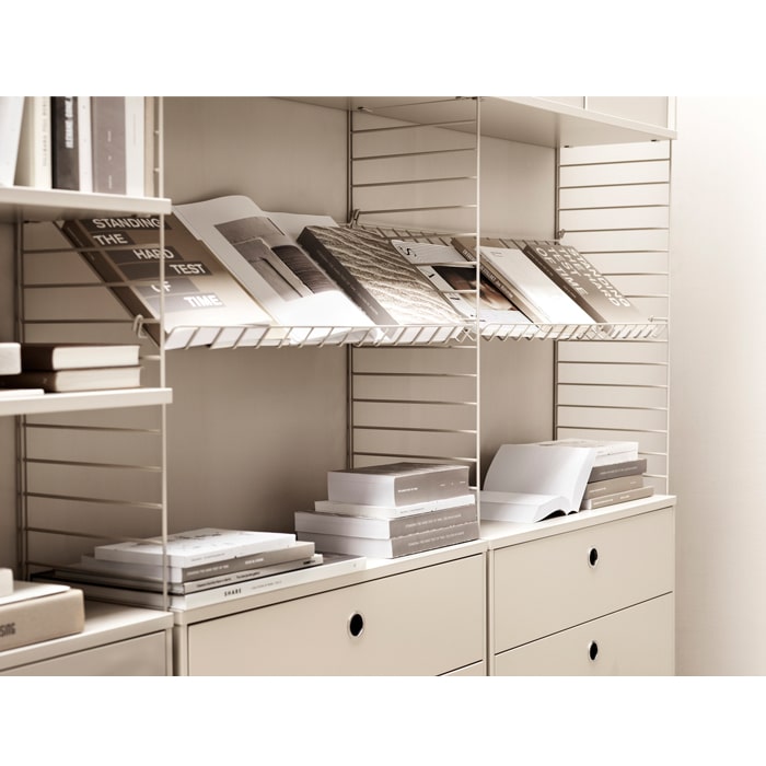 The magazine shelf in wire is available in one width, 78 cm, and fit into 30 cm deep wire panels from String® System. The magazine shelves create a dynamic shelving combination where you have room to showcase your favourite books and magazines. The magazine shelf in wire gives you plenty of room to be creative by adding s-hooks. The magazine shelf will blend right into your string shelf since their unique wire design is the same. Choose a magazine shelf in the same colour as your panels or make your magazine shelf pop by picking a different colour.