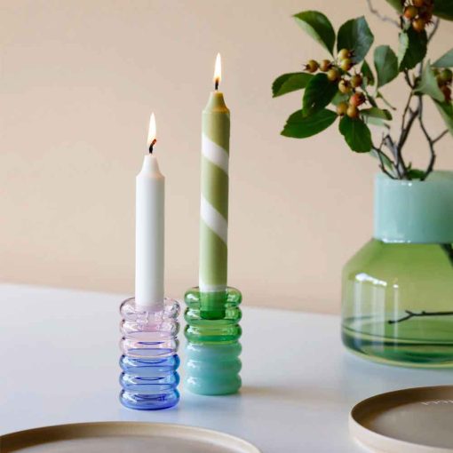 With generous curves and unique colour combinations, Tube Candle Holder is sure to brighten up any room. Perfect for a beautiful table setting or as decoration on the coffee table, on the shelf or in the window sill. Available in green/milky green, pink/blue and smoke/milky yellow.