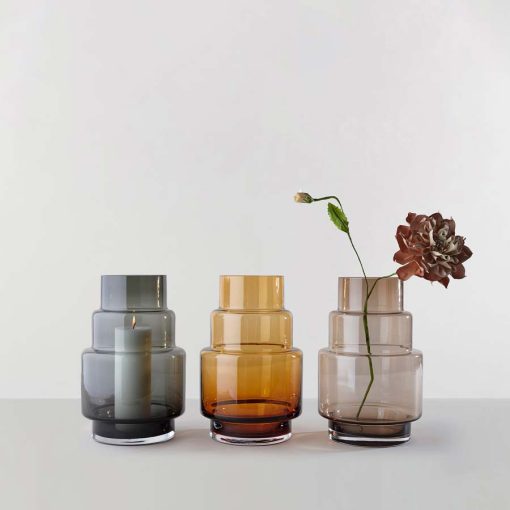 Hurricane no. 69 is for the larger space in a home both indoor and outdoor. Designed to carry a pillar candle or LED, but also suitable for flowers. Placed as a centrepiece at the table it brings lighting atmosphere to the family evening in the garden. It has a size suitable for floor lighting creating a cosy corner at the terrasse in the lounge area together with flowerpots etc. The design has a spacious inner room which makes the candle flame burn steady.  The stand is wide and heavy, so it doesn’t move or tip over in the wind. The opening has a size that makes all larger flower bouquets spread out nicely.