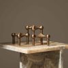 Cleaning and maintenance: This special piece is made of solid brass that has undergone a process of oxidation to achieve the bronzed finish. The brass is left untreated and will patinate over time. You can easily remove candle drips by placing the candle holder in hot water with a drop of detergent. After removing drips please refrain from polishing your candle holder as this will ruin the bronzed finish. Please note that marks may occur on the legs after repeated stacking due to natural wear and tear unveiling the clean brass surface.