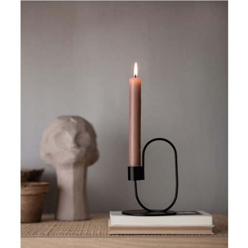 “Swoop is a light and elegant candlestick that draws threads back to the classic candlestick- with handles, but in a modern and playful shape. The handle makes it easy to move around.“