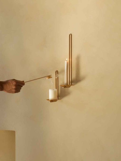 Inspired by medieval candle holder designs, the Clip Wall Candleholder in black powder-coated metal or gleaming brass is simple in form yet powerful in expression. Exploring equilibrium, its finely turned metal frame holds a drip tray that seems to float on air.