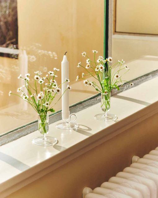 Designed for HAY by Nikolaj Mentze from STUDIO 0405, the Tiny Candleholder is a series of elegant candleholders in borosilicate glass. Functional and decorative, the designs feature either a slim stem or looped handle that make them easy to move around and a wide base to catch the dripping wax. Available in both clear and coloured glass, the Tiny Candleholders can be used alone or styled with other variants or HAY candleholders to create atmospheric displays on shelves, tables, or windowsills.