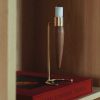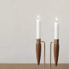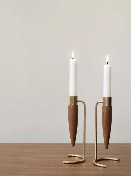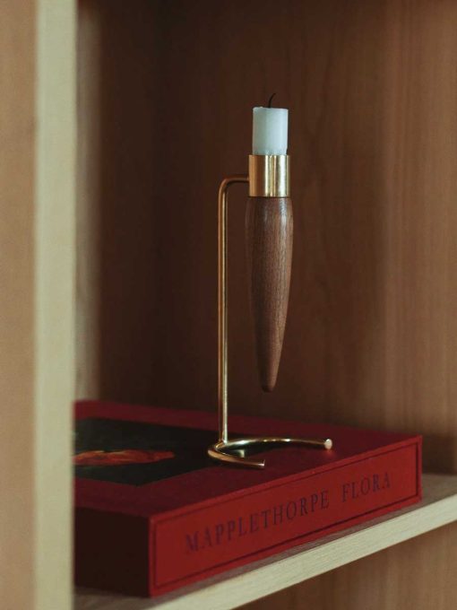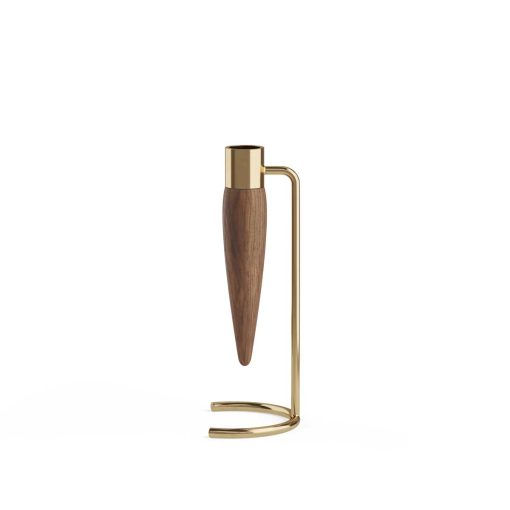 The sleek shape of the Umanoff Candle Holder is crafted from solid walnut, tapered to a point, and suspended from a polished brass frame that will patinate beautifully over time. Designed to hold a single candle, its characterful silhouette brings personality wherever it is placed.