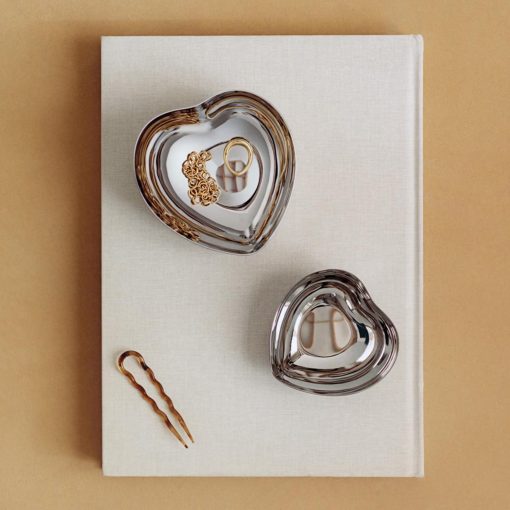 This heart-shaped bowl is a thoughtful token of affection. Its stainless steel form makes it a versatile addition to any desk or dressing table, offering a practical way to hold jewellery and small items, or to serve food such as nuts and sweets. Available in two sizes, the smaller bowl fits neatly inside the larger one.
