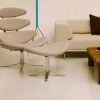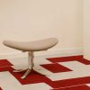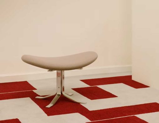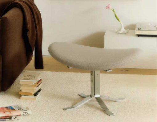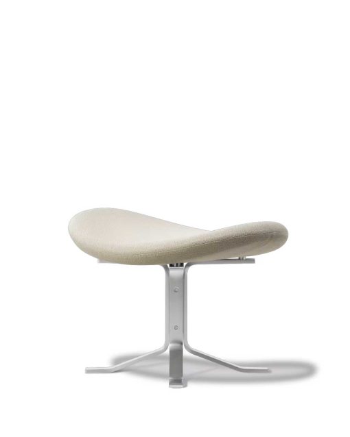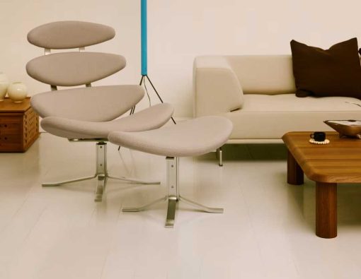 The Corona Chair is an eye-catching and experimental take on Danish design. A stringent design with elliptically shaped, upholstered seat pads descending in size. The accompanying footstool features the same base and upholstery finish seen in the lounge chair.