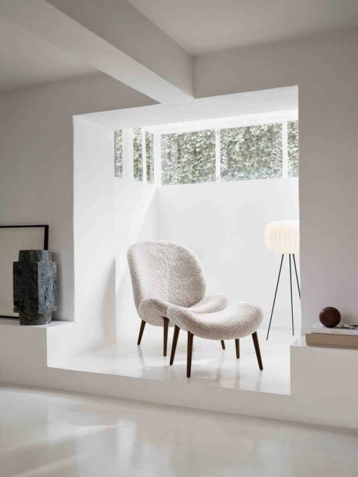 The Lodge footstool is a free-standing footrest to be paired with the Lodge lounge chair. This footstool features a molded soft shell and legs in solid oak.