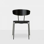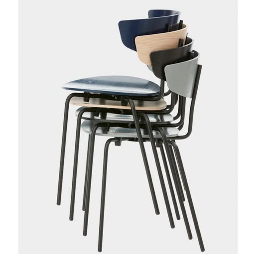 Herman chair is elegant, well designed and comfortable enough to hold you for hours and hours. The lightweight design and the welcoming look make it suitable for both dining room tables at home and large conference facilities. The seat has an oval shape that rises a little on the edges; the arms on the backrest provide a good support and the frame holding the backrest allows you to comfortably rock a little back and forth. The chairs are easily stacked and as a nice added detail the angles of the wooden backrests are designed so the chairs can be hung on the table – making room to dust and clean the floors underneath. Herman chair has a black powder coated metal frame and the seat and backrest are available in blue, grey, black or lacquered oak. Herman chair is designed by Herman Studio and produced by ferm LIVING.