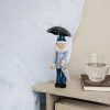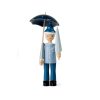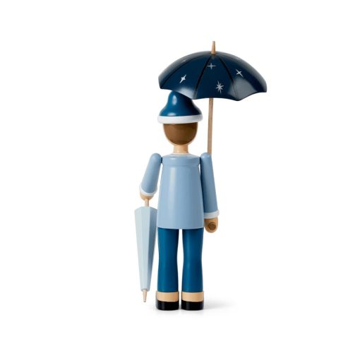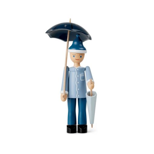 The Nightingale, the Shepherd and the Chimney Sweep are already on the shelves in the museum shop in Odense and on rosendahl.com, and they will now be joined by Ole Lukøje, who you will also be able to find in your local design store. Wearing a light blue night shirt, dark blue night trousers, slippers and a small hat, Ole Lukøje stands happily and smiling with his two umbrellas. The colors are calm and kept in cool shades of blue. Ole Lukøje is turned in FSC®-certified beech wood, and the manual production with paint and printing is carried out with the great precision and care that characterizes the wooden figures from Kay Bojesen. The shape is based on the original Ole figures from Kay Bojesen’s archive, which are simple and minimalist, but full of life and soul – so Ole Lukøje gets the feeling of magic and adventure that is in line with Kay Bojesen’s spirit and the storytelling, he managed to create,