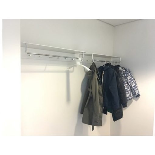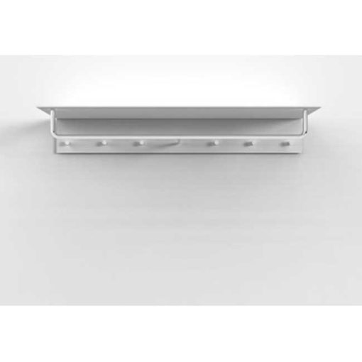 Hat rack with 6 hooks and clothes rail. Matt white wardrobe rack with polished stainless steel rods/hooks. The series contains home products for wardrobes, hallways and living rooms. The products can be put together in countless combinations.