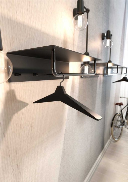 Wardrobe shelf with bar and 4 hooks. Polished black bar/hooks. The UNU system encompasses furnishing products for closets, hall ways and living rooms. Also available in 200mm und 1000mm